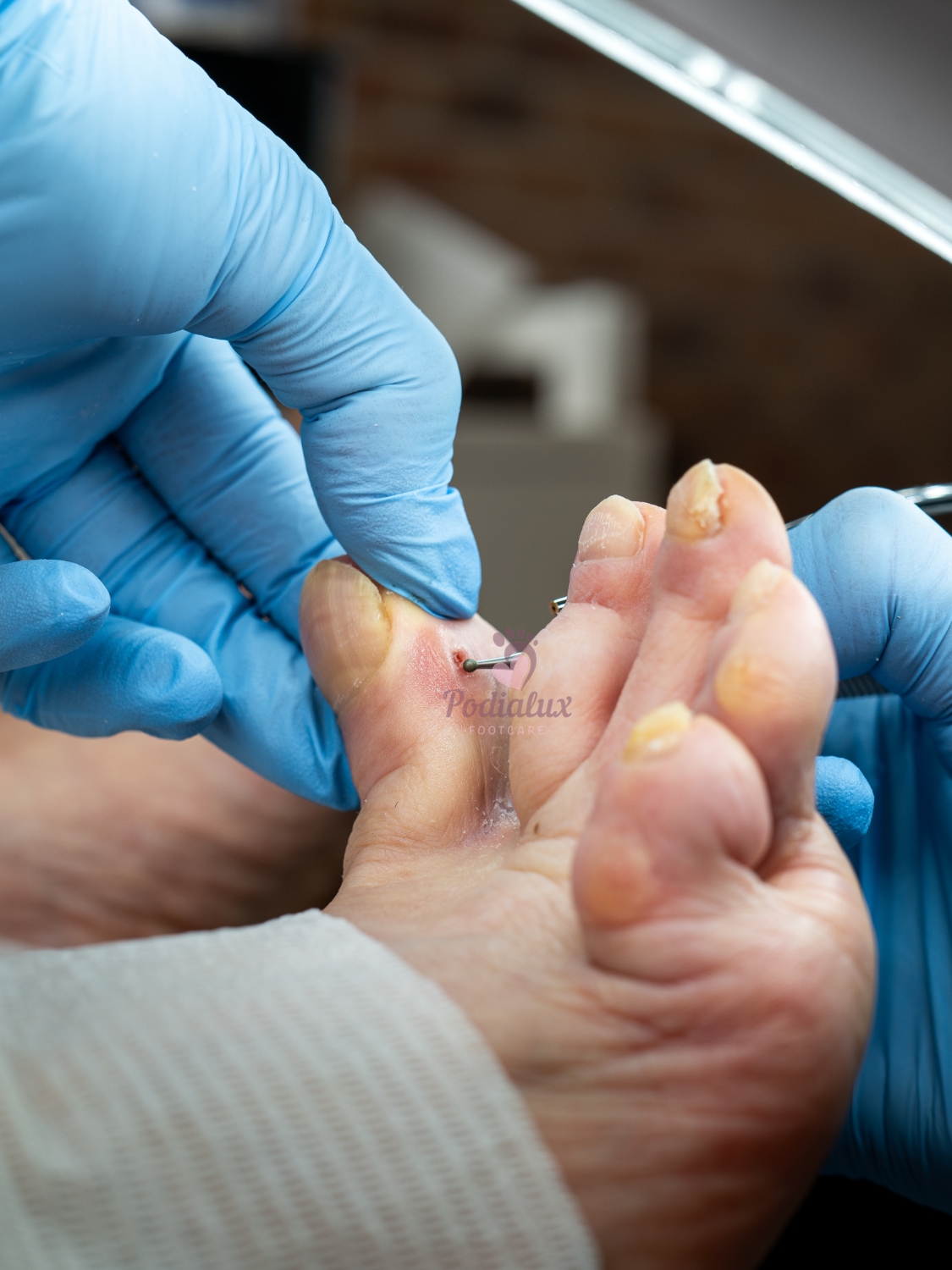 - Fraise diamantée gros avec bague verte : Traitement des callosités naissantes et affinage léger de l’ongle.